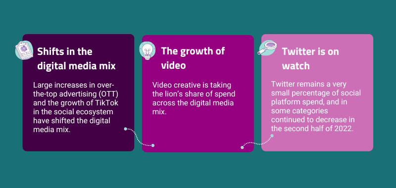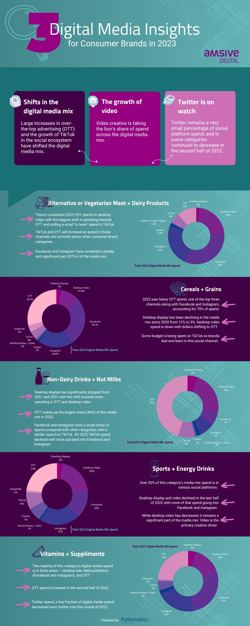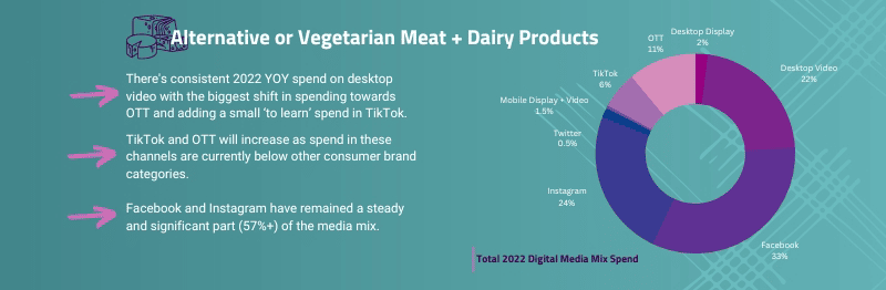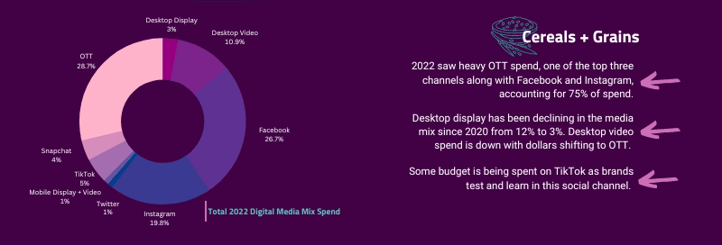 Three Shifts in Digital Media Consumer Brands Can Plan For in 2023 Karen Koslow Client Strategy & Practice Lead, Influencer & Content Marketing Published: January 18, 2023 4 min read Categories: Data + Analytics Consumer behaviors are changing, and so is the content they are consuming. Streaming video and video-based social content took a major leap forward in 2022, and look poised to continue their growth in the coming year. Consumer brands will need to take advantage of the right channels to reach consumers, and knowing where to start hinges on digging into the data available to get a clearer picture of where people are already spending their time and money. What steps are you taking to gain a head start in 2023? Knowing how and where to spend your ad dollars helps you get the most out of your budget. Partnering with Pathmatics, a leading digital media measurement company, we’ve compiled and highlighted some key trends from 2022 in the world of consumer brands. The categories we keyed in on include: Alternative & Vegetarian Meat & Dairy Products Cereals and Grains Non-Dairy Drinks & Nut Milks Sports & Energy Drinks Vitamins & Supplements The data shows just how much the digital media mix has shifted—over the past year, we’ve seen large increases in OTT and TikTok ad spending, with video creative as a whole making up the vast majority of spend in social media. Generally, TikTok’s share of the market grew considerably last year, with the top 1,000 advertisers in the US increasing their spend by 66% on the platform from just September to October of 2022. Along with the growing popularity of the video-sharing platform, it offers considerably lower CPM (cost per 1,000 impressions) than its social media counterparts. Consumer brands are capitalizing on this. According to recent data, TikTok’s CPM ranges from two-thirds to more than 60% less than competitors. Over the past two years, Meta has significantly increased the CPMs of its major platforms, Facebook and Instagram, so this reduced cost and increasing reach of the newer social site offers untapped opportunities. On the flip side, Twitter takes an extremely small percentage of spend on social platforms, and in some cases dropped even further in the second half of 2022. This infographic lays out a bird’s-eye view of these changes. Click for full-sized image Dive Into the Key Stats to Better Understand the Digital Media Landscape As mentioned above, the key insights we gleaned from the collected 2022 data were threefold: Shifts to where ad dollars are going. OTT made up the highest percentage of spend in three out of five of the highlighted categories, with only alternative and vegetarian meat and dairy products significantly outspending in other areas. While TikTok ad spend was notably lower, its meteoric rise in market share cannot be dismissed. Short-form video as a whole is gaining prominence across social media and video sites and will continue to increase its hold on public attention. Increases in video spend. Every single category saw significantly higher spend on video ads compared to display ads in 2022, ranging from 3.6x higher spend in Grains and Cereals to as much as 11x higher in Alternative & Vegetarian Meat & Dairy Products. Twitter’s ad share is falling. Twitter’s advertising woes have been well-documented over the past several months, so it should come as no surprise that the social media site saw limited numbers in our data. Beyond these recent troubles, consumer brands don’t normally advertise on Twitter—they want to appear where their customers are, which is overwhelmingly on other sites like Facebook, Instagram, and the newest rising juggernaut TikTok. Whether this site recovers those lost advertisers is a hot topic in the tech world and bears paying attention to it as the company likely makes new pushes to regain its financial footing. With these overarching insights in mind, let’s dig deeper into the five pivotal consumer brand categories we have outlined. Gain more digital insight. Stay in the know with the latest from our expert teams, helping you turn digital insights into actionable results. PhoneThis field is for validation purposes and should be left unchanged.Email(Required) Sign Up Alternative & Vegetarian Meat & Dairy Products Desktop video spending saw a notable increase in the back half of 2022, jumping from 15.7% of the total spend to 22%. On the flip side, Facebook and Instagram ad spending both dropped—35.3% to 33% and 31.4% to 24% respectively—in the back half of the year. Even with those drops, Meta’s platforms had a dominant hold on this space in 2022. Cereals and Grains Facebook, Instagram, and OTT ad spending account for 76% of all ad dollars in the Cereal and Grains space. Some of this dominance is a result of ad dollars moving away from desktop display—down to just 3% of the total, compared to 12% as recently as 2020—and the growth of TikTok as a platform. Brands are still in the experimental phase with TikTok, and that number will likely continue to grow moving forward. Non-Dairy Drinks & Nut Milks OTT is king when it comes to this category, taking up 45% of the total ad spend for 2022. It dipped a little from the first half of the year when it made up nearly 50% of total spending, but no other area even came close. Mobile and desktop display ads continue to decline year over year, and Meta saw increases in both Facebook (3.8% to 7%) and Instagram (6.7% to 8%) over the back half of the year. This is the only category covered here where these platforms didn’t see a double-digit share of ad spend last year. Sports & Energy Drinks Social platforms were the major target of advertisers in this space, with a notable percentage of spending diverting from desktop display and video ads to Facebook and Instagram in particular. While desktop video ads are taking up less space than they have in the past, it remains a significant part of the landscape. Video content as a who